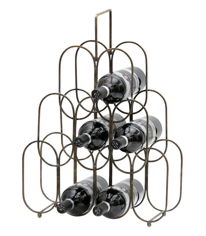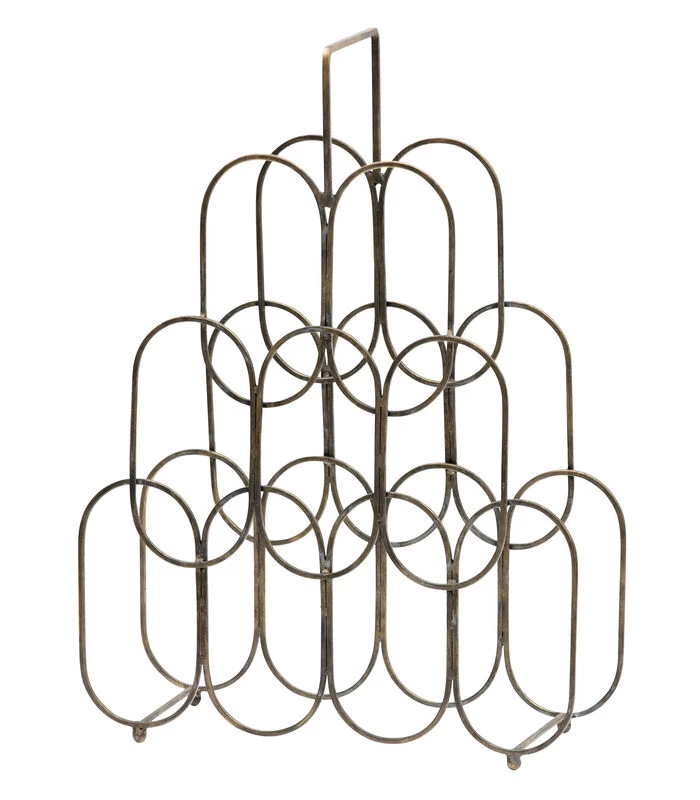 BePureHome heeft dit originele wijnrek nieuw in de collectie. Het rek heeft een sierlijke en tegelijkertijd stoere uitstraling. Het fijne metaal heeft een antique brass afwerking gekregen en dat maakt dat het wijnrek perfect in de stijl van BePureHome past. Je kunt er maar liefst 9 wijnflessen in opbergen. Een rek als dit hoeft trouwens niet alleen functioneel te zijn, maar mag gezien worden, en is met een paar flessen erin echt een sfeermaker in huis.