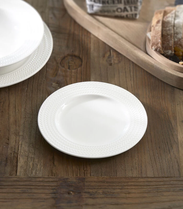Lekker wakker worden met je cracker of boterham op een ontbijtbordje van de RM Bellecôte serviesserie. Mooi versierd met een visgraat randje, ingewerkt in het keramiek. Rustig decor, voor optimaal genieten van je voedsel.