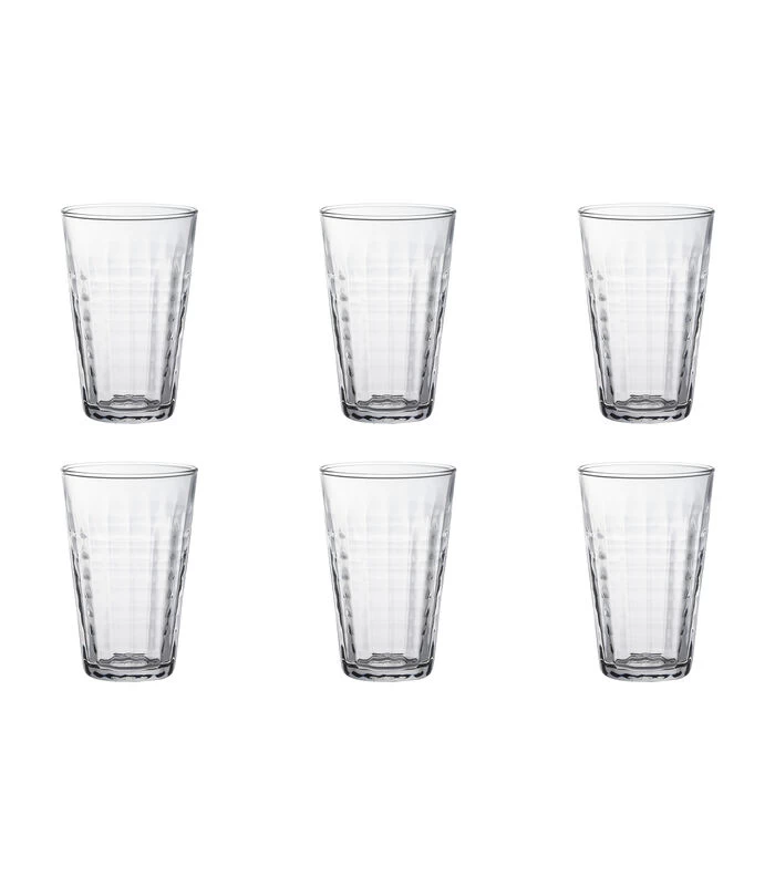 De Prisme longdrinks van Duralex hebben een stoer uiterlijk. De aparte glasbewerking valt meteen op. Deze longdrinkglazen hebben een prachtig stijlvol design en zijn erg multifunctioneel. Deze longdrinkglazen kun je gebruiken voor het serveren van koude– en warme toepassingen, bijvoorbeeld een latte macchiato of een heerlijke cocktail. De glazen zijn namelijk gemaakt van gehard glas en schokbestendig en bestand tegen thermische schommelingen. Daarnaast zijn deze longdrinks stapelbaar en nemen ze ook nog eens weinig ruimte in. Na gebruik kunnen deze glazen eenvoudig gereinigd worden in de vaatwasmachine. Deze set bestaat uit 6 transparante longdrinkglazen met een inhoudsmaat van 33 cl.