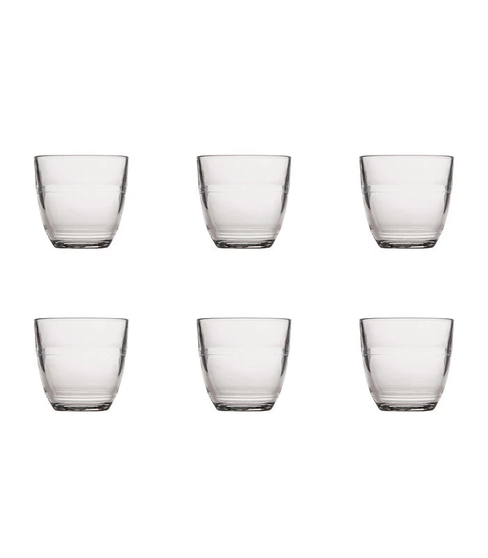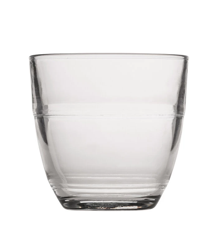 Het universele karakter van deze Gigogne waterglazen van Duralex passen perfect binnen iedere tafelsetting. De glazen hebben een mooi rond design en zijn daardoor gemakkelijk stapelbaar. Daarnaast zijn deze glazen gemaakt van gehard glas, wat ze bestand maakt tegen thermische schommelingen. Serveer in deze glazen dus niet alleen sap en water, maar ook een heerlijke kop koffie of cappuccino. En na gebruik zet je ze snel in de vaatwasmachine voor reiniging. Deze set bestaat uit 6 waterglazen met een inhoudsmaat van 22 cl.