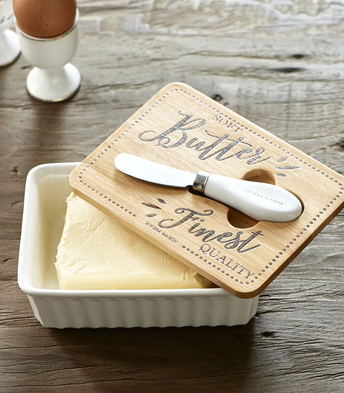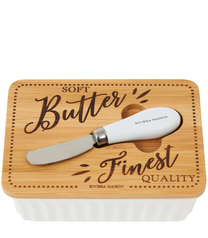 Deze porseleinen botervloot is een lust voor het oog. In het houten deksel is ruimte voor een bijpassend botermes, zodat u dit altijd bij de hand heeft als u de boter op een broodje wilt smeren. Door de uitsparingen aan de zijkanten van het botermesje, kost het geen enkele moeite om hem te pakken.