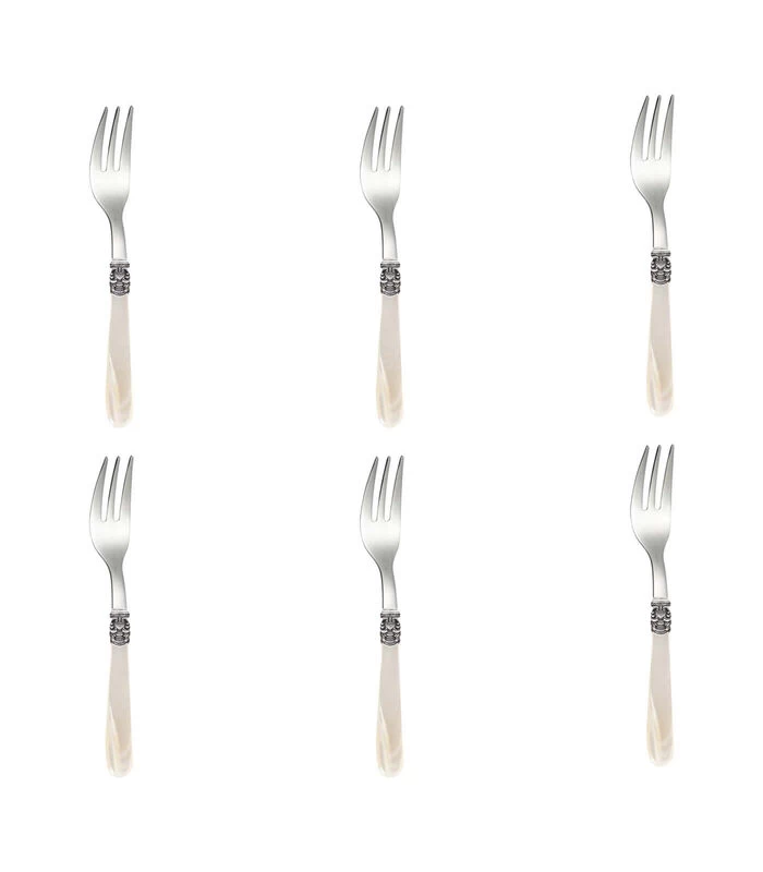 Dit EME Mona Lisa bestek is ontwikkeld voor de liefhebber van bestek van Italiaanse hoogwaardige kwaliteit en een eigentijdse afwerking. Traditioneel en modern is in deze gebaksvorken samen gebracht, waarbij het bestek nog steeds licht in gewicht is. Deze serie kenmerkt zich door een uitstekende balans in dikte van het handvat en het lange, elegante lemmet. Deze prachtige gebaksvorken zijn gemaakt van het materiaal 18/10 roestvrij staal en hebben een acryl ivoorkleurig handvat.