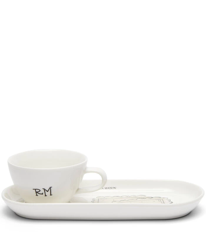 De Coffee Cookie Cup & Saucer is een vrolijk wit kopje voor koffie en wordt geleverd met een bijpassende saucer, een schotel voor bijvoorbeeld een koekje. Op het kopje staat in een sierlijk handschrift ‘RM’ geschreven. Op het schoteltje is een tekening van koekjes te zien. Gemaakt van porselein.