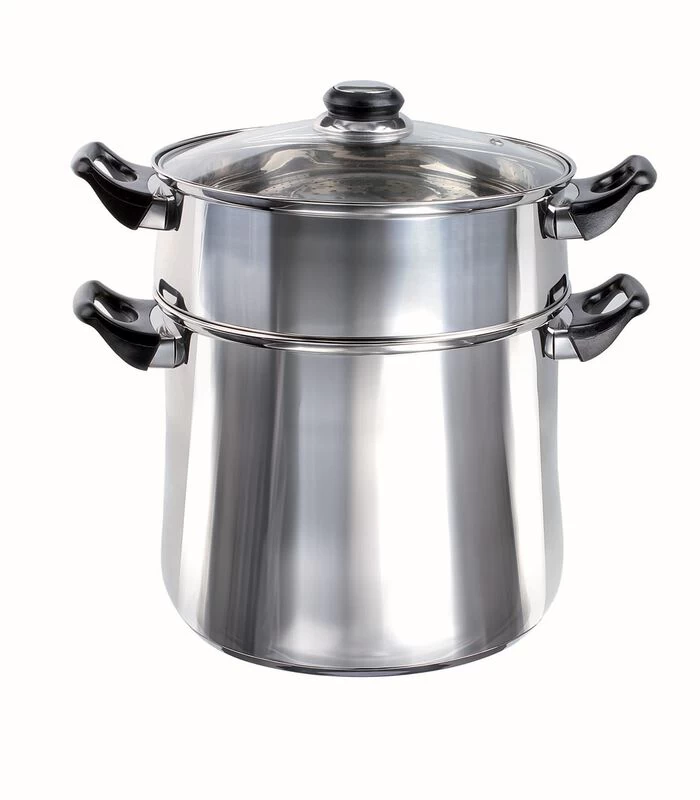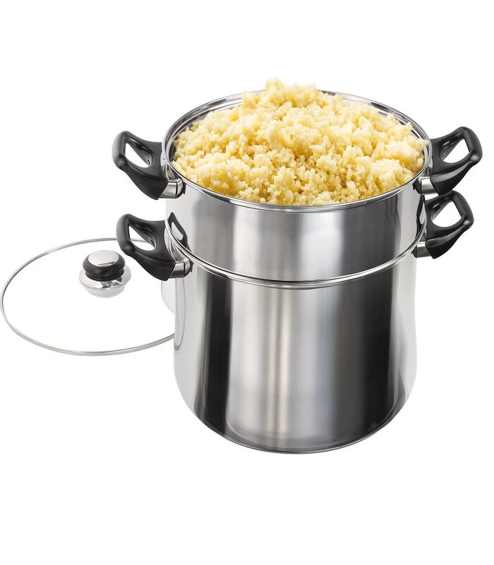 Couscouspot. Roestvrijstaal 24 cm. Inhoud 12 l, stoommandje, gehard glazen deksel met stoomontluchting. Hittebestendige handgrepen. Geschikt voor alle soorten fornuizen, met inbegrip van inductie.