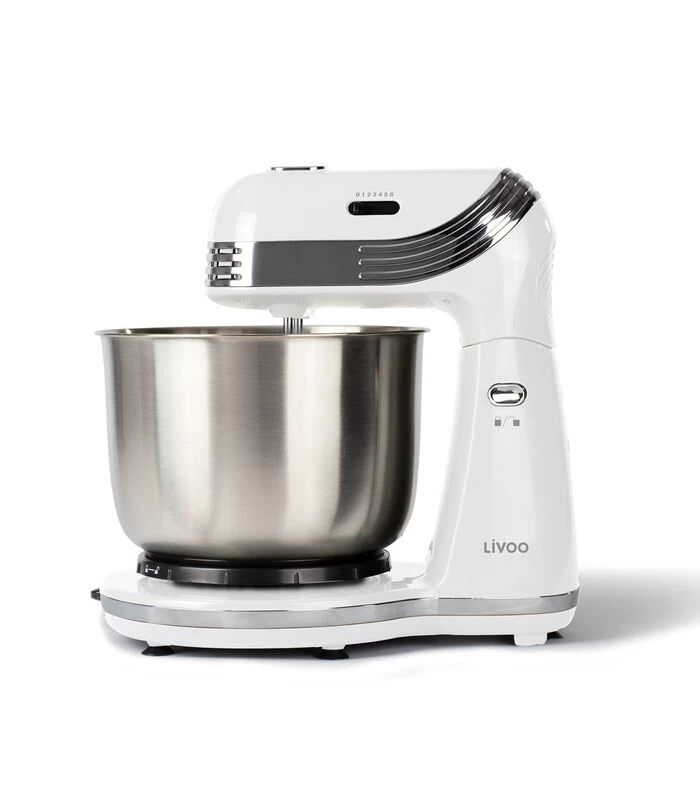 Multifunctionele mixer om uw zoete en hartige gerechten te bereiden. Roestvrijstalen kom met een inhoud van 3 l. 6 snelheden variaties. 2 hulpmiddelen: metalen garde, deeghaak, voor het kneden, klopen en mixen van uw pasta, taarten, pannenkoeken, pizza, eiwit, pasta, slagroom, brood, taartjes , desserts. Schuifknop om de kom op de basis te schuiven voor een eenvormige mengsel en eenvoudig te verwijderen. Uitwerpknop. Antislipvoetjes.
