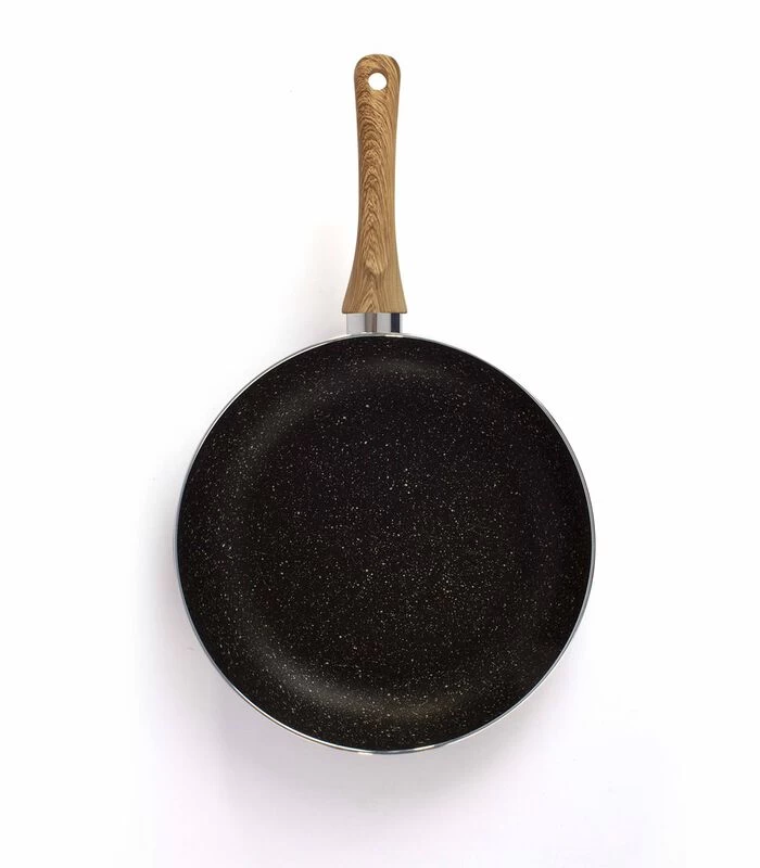 Antikleef stenen coating uiterlijk 20, 24 and 28 cm. Hittebestendig zacht aanvoelend, met siliconen gecoat bakelieten handgreep. Compatibel met inductiekoken. Niet nodig vet toe te voegen.