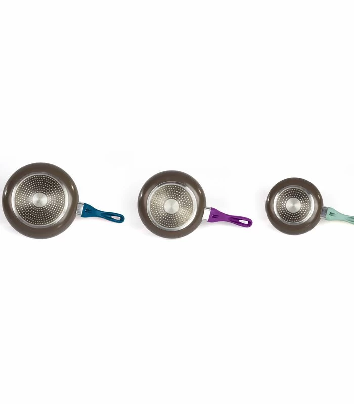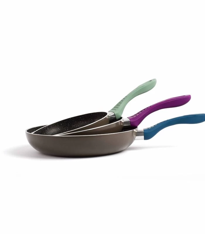 Set van 3 aluminium braadpannen. Antiaanbakcoating. Kwaliteit ILAG®. Steenmotief. Diameter 20, 24, 28 cm. Zachte–touch siliconen gecoate handgreep. Compatibel met inductie warmte. Koken zonder vet.