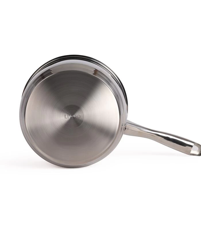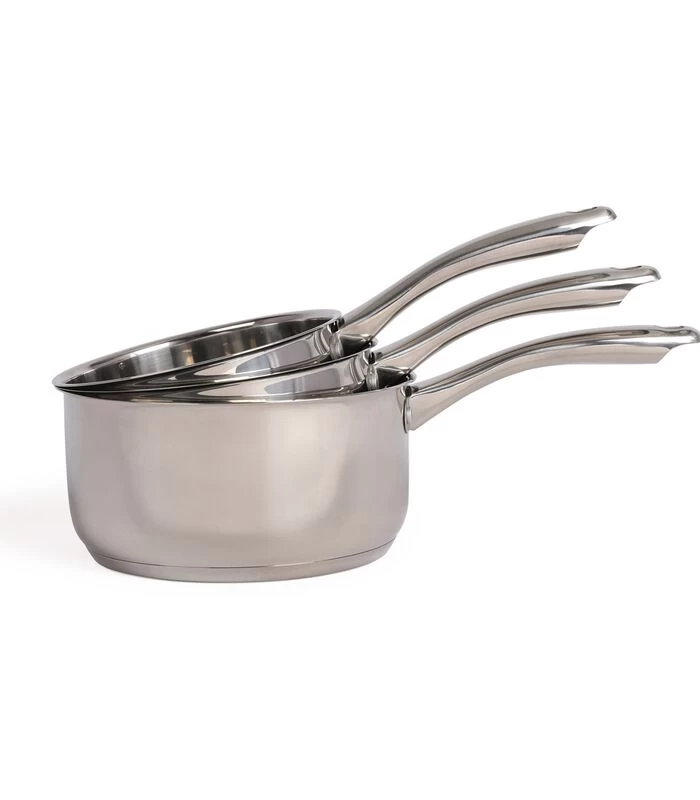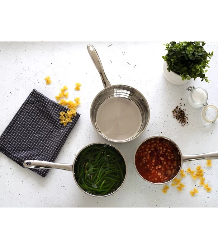 – Set van 3 pannen – Roestvrijstalen binnenbekleding – 2mm dikte aluminium ingekapselde bodem – Diameter 16, 18 en 20 cm – Hittebestendige roestvrijstalen handvat – Compatibel met alle haarden, waaronder inductie en oven