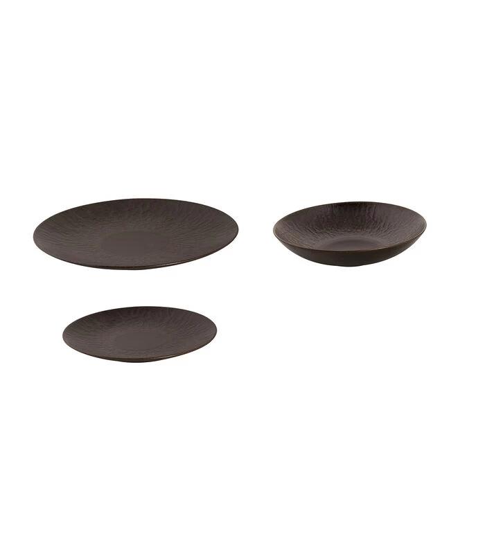 Deze opvallende Ruston serie van Palmer heeft een prachtige diepbruine kleur. De borden uit deze elegante 18–delige serviesset hebben naast een chique kleur ook een mooi patroon wat de items bijzonder maakt. Laat je culinaire creaties tot zijn recht komen en presenteer deze op dit elegante donkere servies. De borden uit deze set zijn gemaakt van het materiaal stoneware en zijn oven– en magnetronbestendig tot een temperatuur van 220℃. Na gebruik kan alles gereinigd worden in de vaatwasmachine. Deze set bestaat uit 6 dinerborden van 27 cm, 6 ontbijtborden met een doorsnede van 21 cm en 6 diepe borden van 22 cm.