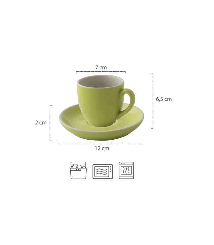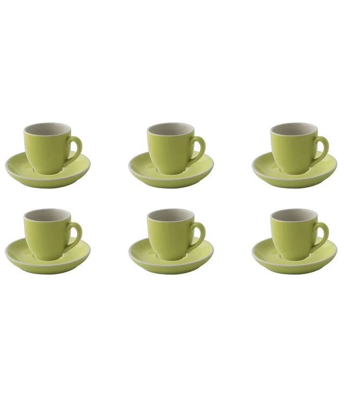 Serveer je koffie eens op een andere manier met deze prachtige groene Colors koffiekop van Palmer. Deze kop heeft een ruim oor en ligt hierdoor lekker in de hand. Daarnaast is de kop nestbaar. De kop is gemaakt van hoogwaardig en kleurvast porselein en zal zijn kleur behouden. Deze kop is bestand tegen stoten en zal hij niet snel chippen. Het een inhoudsmaat van 14 cl heeft deze kop dé perfecte maat voor een heerlijke koffie of chocomelk. Bij deze koffiekop wordt ook een bijpassende schotel geleverd. Deze schotel heeft een diameter van 12 cm en heeft daarnaast een opstaande rand, waardoor koffieresten worden opgevangen. Deze set bestaat uit 6 koffiekoppen met 6 schotels en vormen samen een chique geheel op de koffietafel.