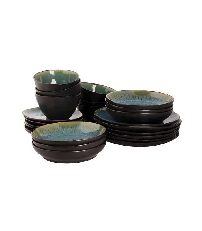 Deze prachtige 24–delige Lotus serviesset van het merk Palmer is met haar spectaculaire turquoise kleur een echte eyecatcher. Op deze borden wordt ieder gerecht een kleurensensatie. De donkere matte afwerking aan de buitenzijde geeft de serie nog een extra rustiek tintje. De borden en kommen uit deze serviesset zijn gemaakt van het materiaal stoneware. Stoneware is oven– en magnetronbestendig tot een temperatuur van 200℃ en kan na gebruik gereinigd worden in de vaatwasmachine. Deze set bestaat uit 6 dinerborden met een diameter van 27,5 cm, 6 kleinere borden van 20,5 cm, 6 diepe pastaborden van 21 cm en 6 kommen met een doorsnede van 15 cm. Let op: ieder item is uniek en kan een lichte afwijking in kleur hebben.