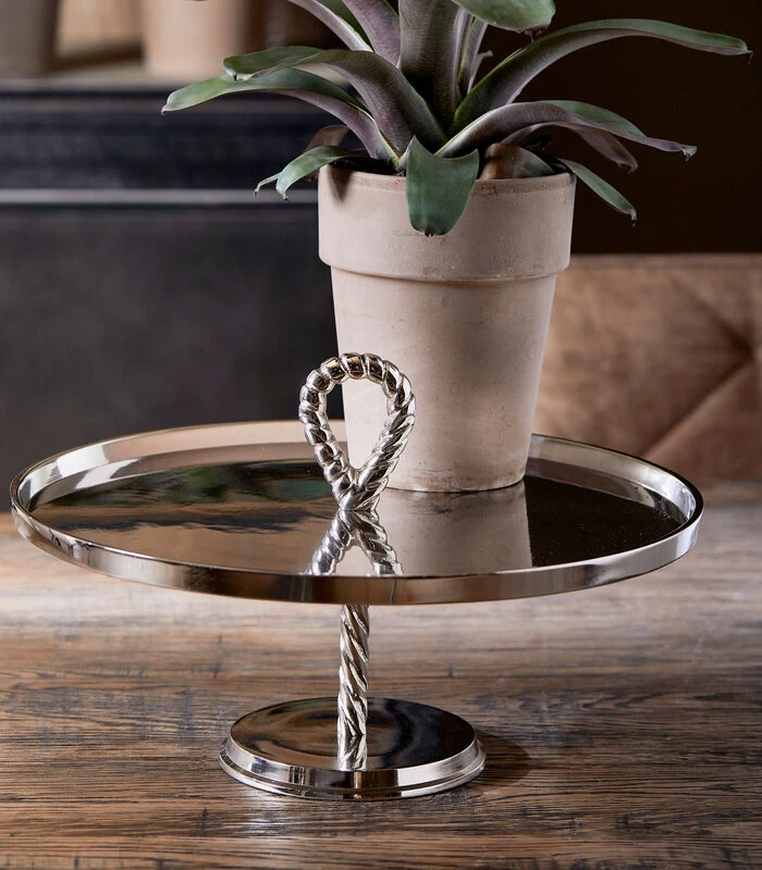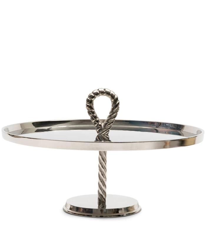 Mooi staaltje vakmanschap, deze Porte Dorée taartschaal. Van glanzend aluminium, met stevige voet en een gedraaide steel met lus om hem te verplaatsen. Hier oogst je lof mee, en zeker als je daarop ook nog eens jouw lekkere hapjes of fruit uitstalt.