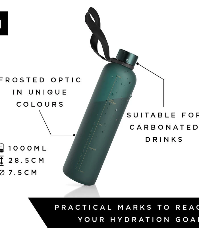 De fles is lekvrij en geschikt voor koolzuurhoudende dranken. De transparante matte look met drankherinnering laat u altijd zien wanneer het tijd is voor een refill.