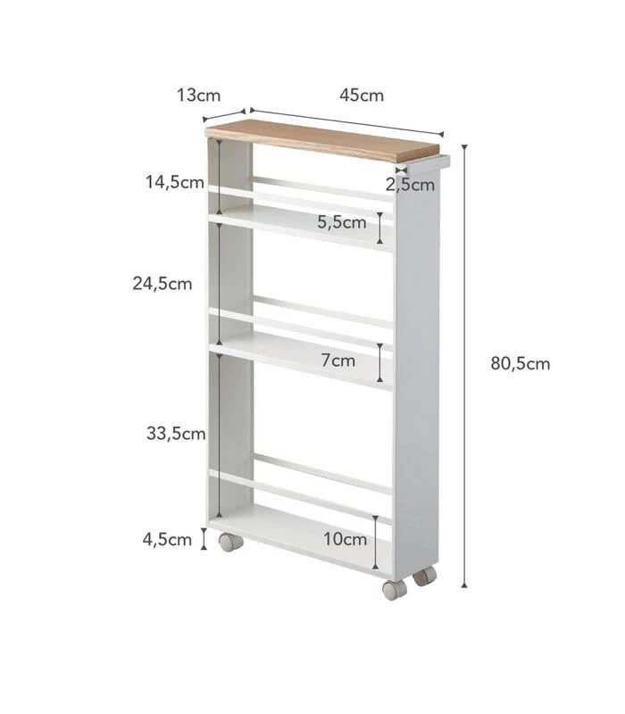 Een kleine opening in de keuken wordt opgevuld met deze slanke trolley. Je kunt hier olie, kruiden, flessen en nog veel meer in kwijt. Met de handgreep kun je de trolley altijd makkelijk tevoorschijn toveren.